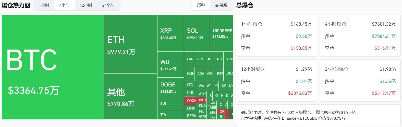 A large number of long positions were liquidated. In the last 12 hours, the number of long liquidations was about three times that of short liquidations.