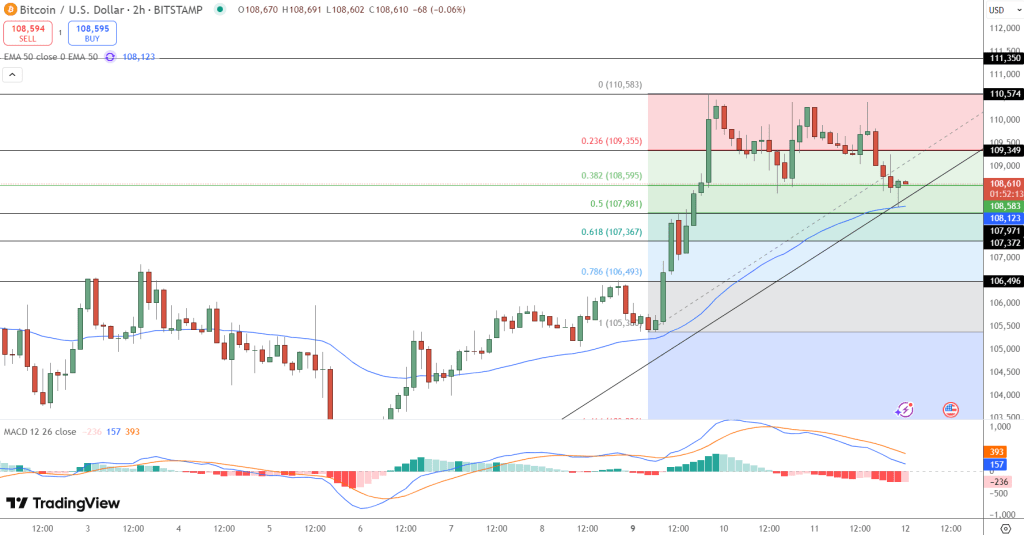 Despite a slight 1.4% decrease in the past 24 hours, Bitcoin price predictions remain technically supported. Trading near $108,610, the two-hour chart shows BTC sitting atop a confluence of supports: 50-EMA ($108,123), an ascending trendline, and a Fibonacci retracement level of 0.382 at $108,595.