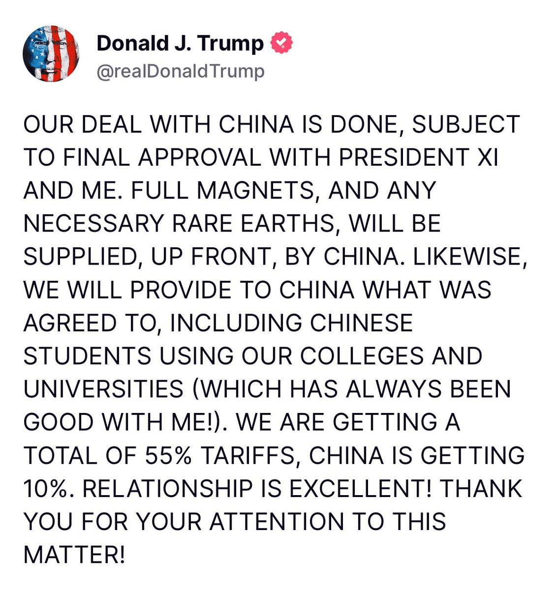 Bitcoin receives a new breath of fresh air from geopolitics. Former U.S. President Donald Trump announced via Truth Social that a long-awaited trade deal with China has been completed, pending approval from President Xi Jinping. This deal is said to include the cancellation of some export tariffs and has been confirmed by trade officials from both countries.