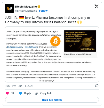 The story of Bitcoin ($BTC ) as a strategic reserve asset has recently attracted additional attention. Evertz Pharma GmbH, a premium natural cosmetics company based in Germany, has become the focus this week after announcing a bold treasury move: buying an additional 100 BTC in May 2025, valued at approximately $10.8 million (10 million euros).