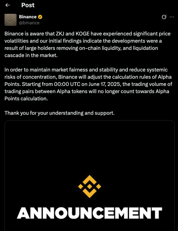 6/15: KOGE and ZKJ drop >60% after a series of suspicious trades, Binance Alpha previously recorded APR for the KOGE/ZKJ pair reaching up to 795% before collapsing.