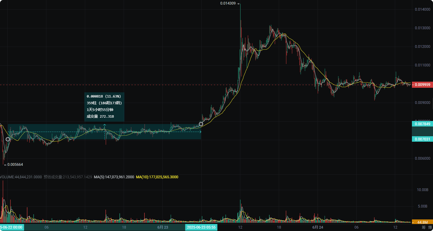 From June 22 at 00:00 to June 23 at 6:00, the FUN price lingered near the BOLL lower band of 0.0073 for nearly 30 hours. The MACD quietly golden crossed below the zero line, and those who understand the technology know this is a precursor to a “dead cat bounce”, with the operator secretly accumulating! The trading volume was sluggish, and retail investors wouldn't notice this small player at all. As a result, at 12:04, a large bullish candle in 5 minutes broke through the Fibonacci 50% resistance level of 0.0087, and trading volume surged by 10 times! But any discerning person could see the problem — the MACD “golden cross above zero” followed by a shrinking red column is textbook “inducing buying”! Who would reduce volume during a breakout? Because it simply isn't real buying; it's just the operator transferring funds from one hand to the other!