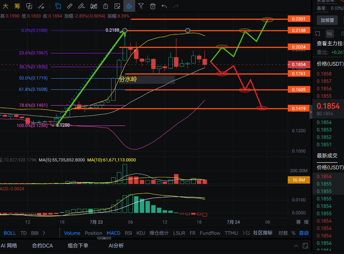 During the surge, the trading volume spiked, but the latest transaction price around 0.1854 shows a clear decrease in volume, indicating that the main force has sold off at the high point of 0.1990, with retail investors standing guard!