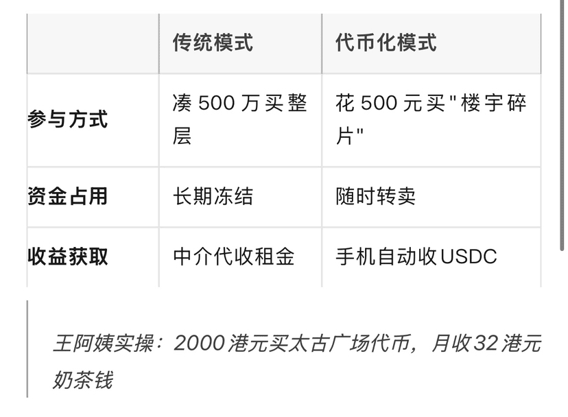 Case: 100,000 tokens split from Hong Kong W Hotel, minimum holding of 100 HKD, rent calculated automatically by the hour