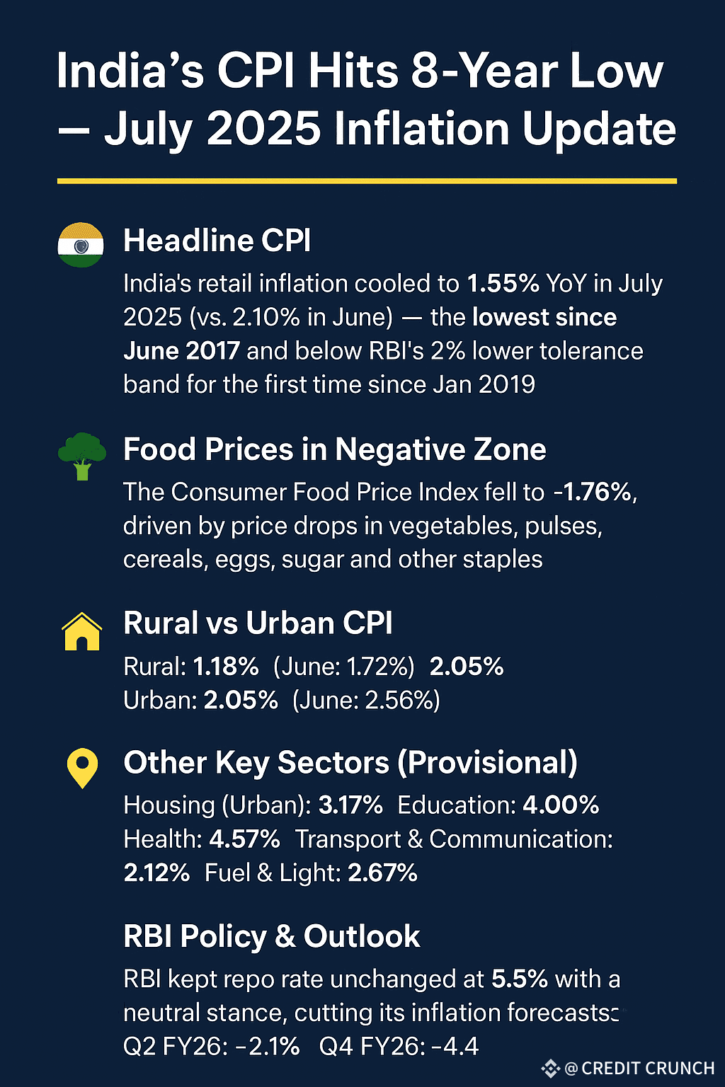 India’s retail inflation dropped sharply to 1.55% YoY in July 2025 (from 2.10% in June), marking the lowest level since June 2017. For the first time since Jan 2019, CPI has also slipped below RBI’s 2% lower tolerance band.