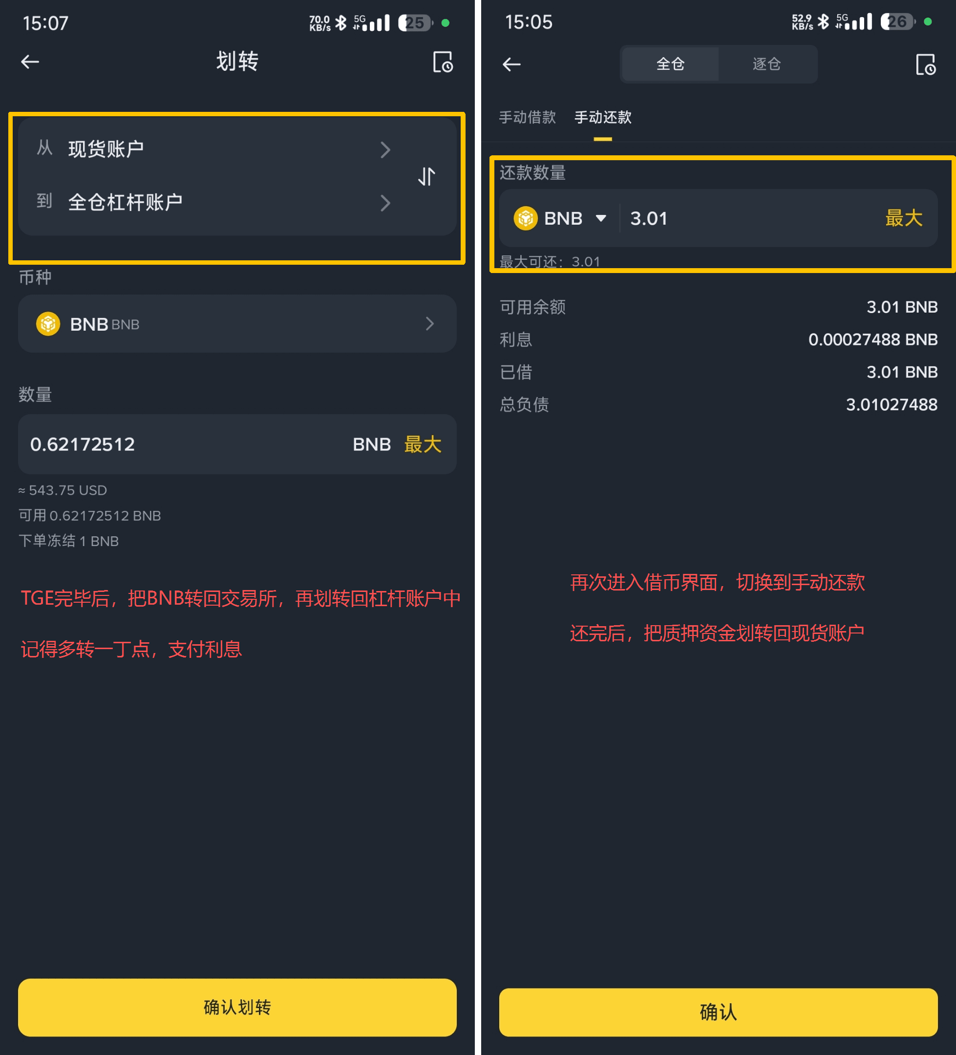 After completing the loan, click 'Transfer' again to transfer the borrowed BNB from the 'Leverage Account' to the 'Spot Account'.