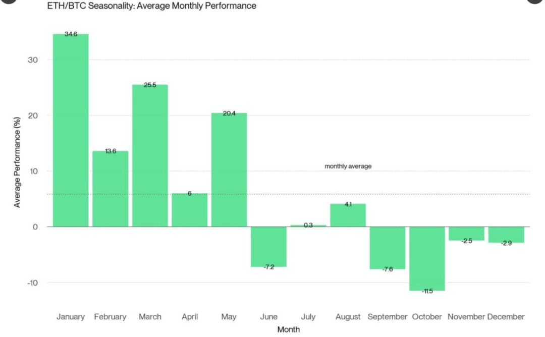 📈 Nevertheless, the seasonality of the ETH/BTC pair shows that Ethereum tends to outperform Bitcoin at the beginning of the year, before losing ground at the end of the year.