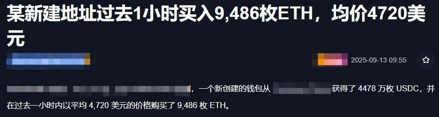 In the early hours of today, the market saw mysterious operations again, with a brand new address suddenly receiving 44.78 million USDC, and within an hour, it aggressively purchased 9,486 ETH at an average price of $4,720!