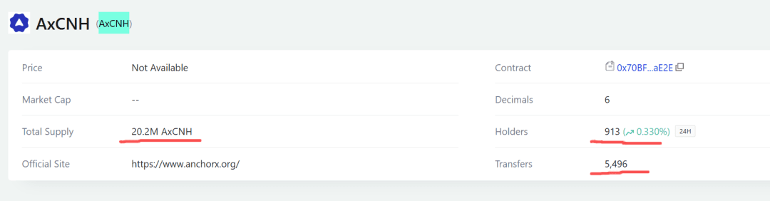 Currently, the minting amount of AxCNH is 20.2 million, and the number of holding addresses is 913.