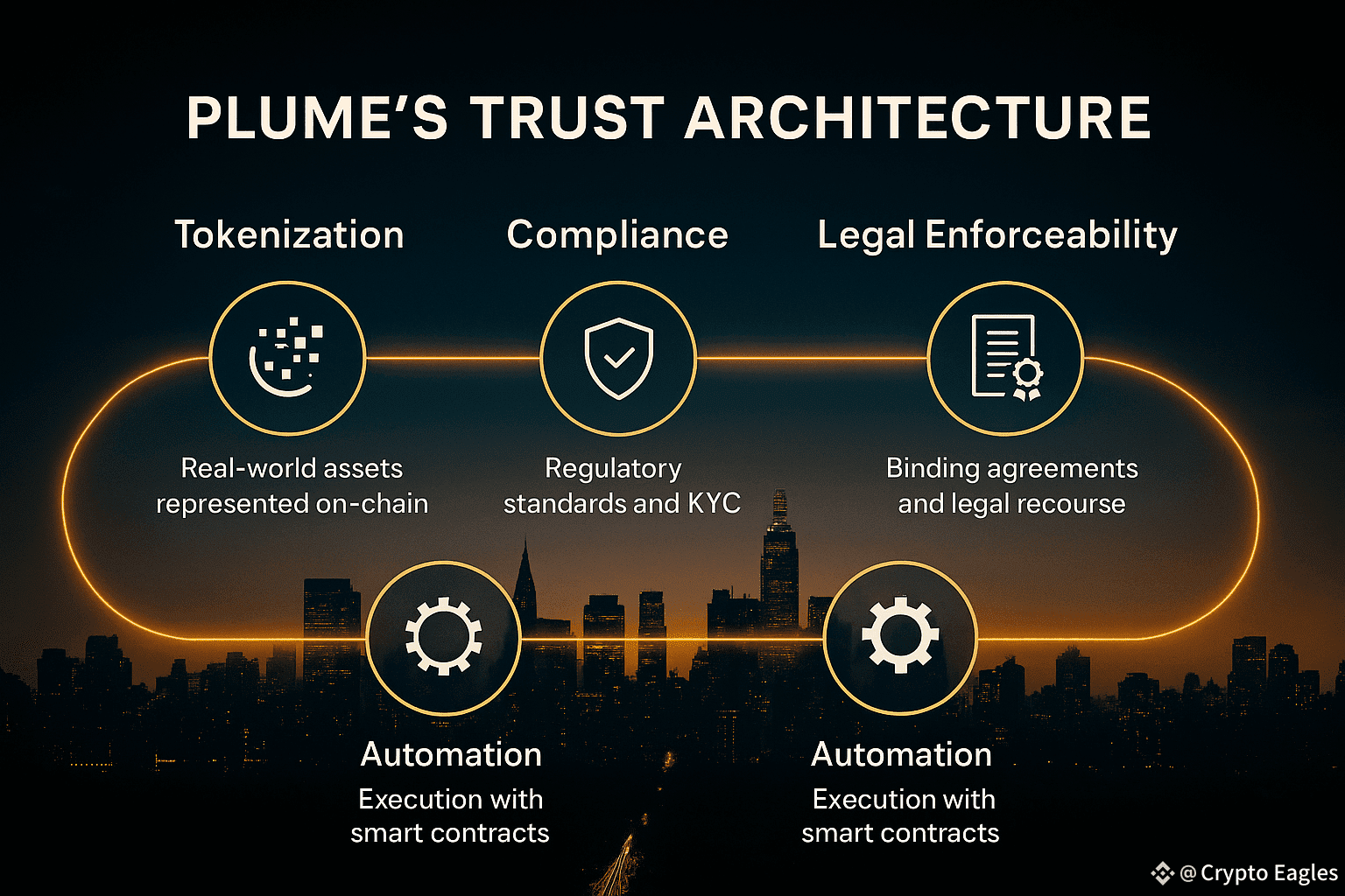 Plume’s greatest innovation lies in embedding trust directly into its infrastructure. Its architecture weaves together legal compliance, programmable enforcement, and transparent records, creating a multi-layered trust system that does not rely solely on reputation or intermediaries