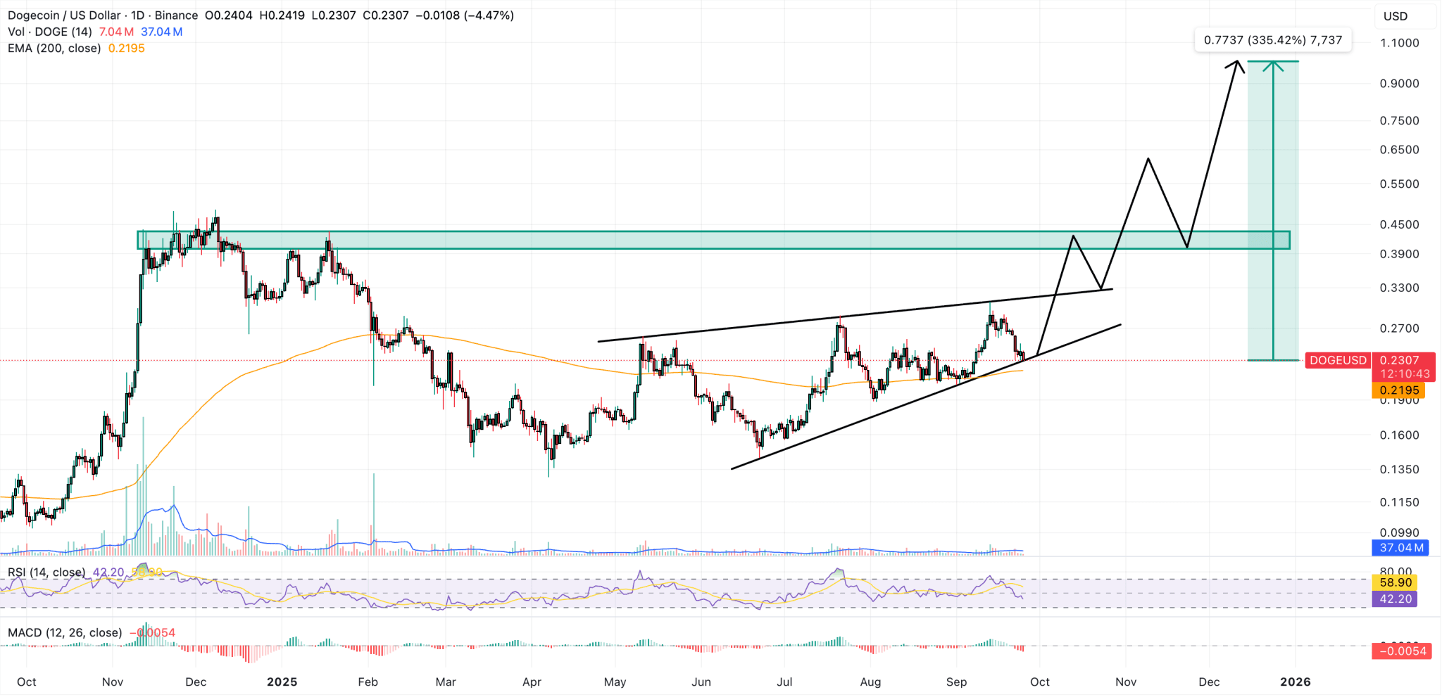 The Chart Play: The technical prediction says that Dogecoin is touching a key support, the famous 200-day EMA (Exponential Moving Average). If buyers manage to defend this critical zone (i.e., if it doesn't drop further), we could see a jump towards the $0.29 or even a serious climb that could take it to $0.40 as the first major target. And if things accelerate with this type of institutional news, some are already dreaming of $1.