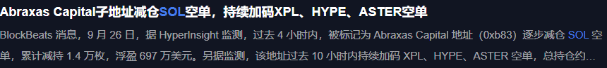 The second chart is more exciting: Abraxas Capital's big player is secretly reducing their SOL short position, closing 14,000 coins at once, with a floating profit of 6.97 million USD! But they immediately turned around to short small coins like XPL and HYPE... What does it indicate? Big funds feel that SOL cannot drop further, temporarily don’t want to crash the market, but instead, run to harvest the altcoins!
