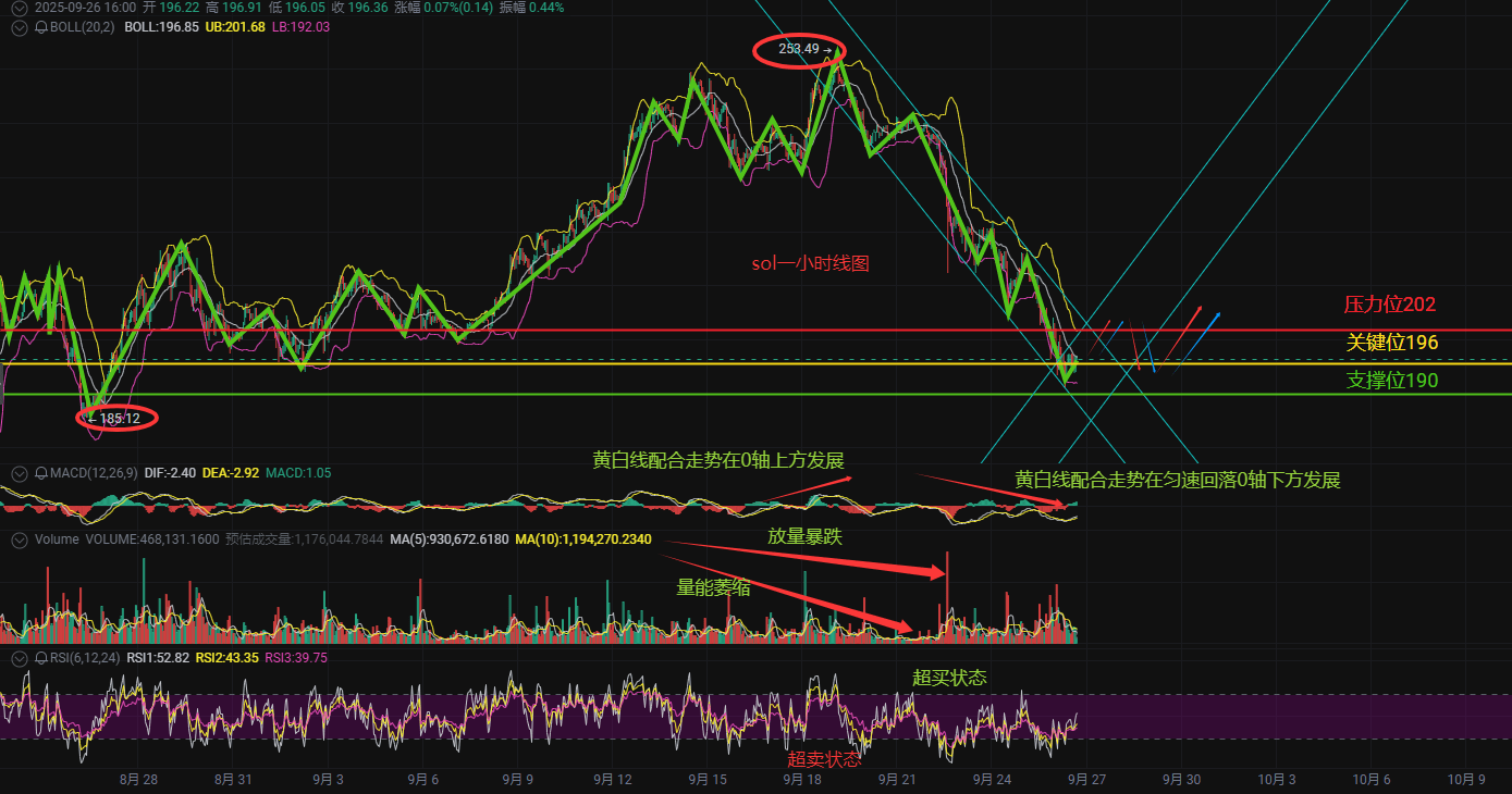 Speaking through the chart: After SOL's one-hour line dropped to 185, it quickly rebounded, but the volume did not keep up (VOL shrank to a thin line), indicating that retail investors are cutting losses, and the main players never intended to really crash the market! The resistance level is 202, support is 190, and the level at 196 is the battlefield for bulls and bears. The price is currently stuck at the middle band of the Bollinger Bands, resembling a tightly compressed spring—breaking the upper band at 202 is a signal to take off, while dropping below 190 we need to be cautious.