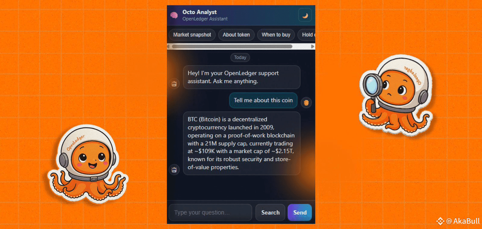 The arrival of Octo Analyst marks a turning point in how decentralized finance participants interact with real-time market intelligence. Instead of treating analytics as a patchwork of tools and data feeds, OpenLedger has built a single conversational engine that turns raw market motion into guided decision making. The bright orange octopus splashed across social media is more than a playful mascot, it signals a shift toward interactive, AI-driven market comprehension where every trader, fund, or protocol can tap into institutional-grade insight through a simple dialogue box.