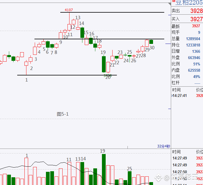今天的课程是第一至第五课知识的综合运用。通过目前豆粕2205最新的1小时实时行情图,请大家跟随我的思路,感受价格流动的趋势方向,以及我的知识体系是如何运用的。