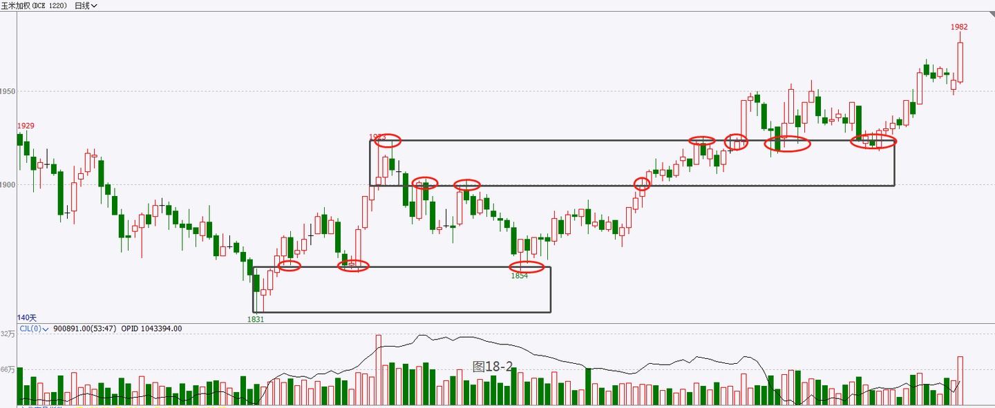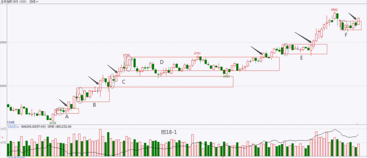As shown in Figure 18-1, the circles represent the first combination of pauses, and the red boxes are the clusters of pause candles, which are areas of high trading volume. From the subsequent breakthroughs indicated by the black arrows, it can be confirmed that a large number of bullish positions are accumulating in these areas.