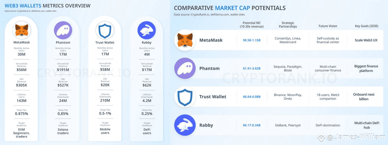 Rabby may be the smallest in raw numbers 4M users across 122 chains but it’s growing aggressively with 3x swap volume growth and just 0.25% fees. Its niche is clear: professional DeFi users seeking efficiency and multi-chain access.
