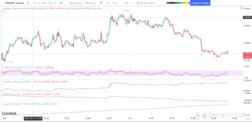The 4-hour POL chart shows a clear downtrend from the September peak near $0.296. After a series of lower highs and lower lows, the pair is now hovering around $0.22, just above support near $0.21.