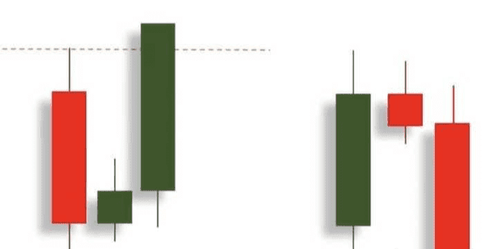 A bearish candlestick surrounded by a small bullish candlestick