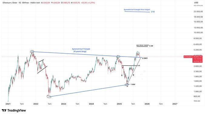 Analysts are seeing very sweet numbers. Trader Crypto GEMs sees that ETH has been moving in a technical pattern that, once broken, points to a quick jump to $4,950.