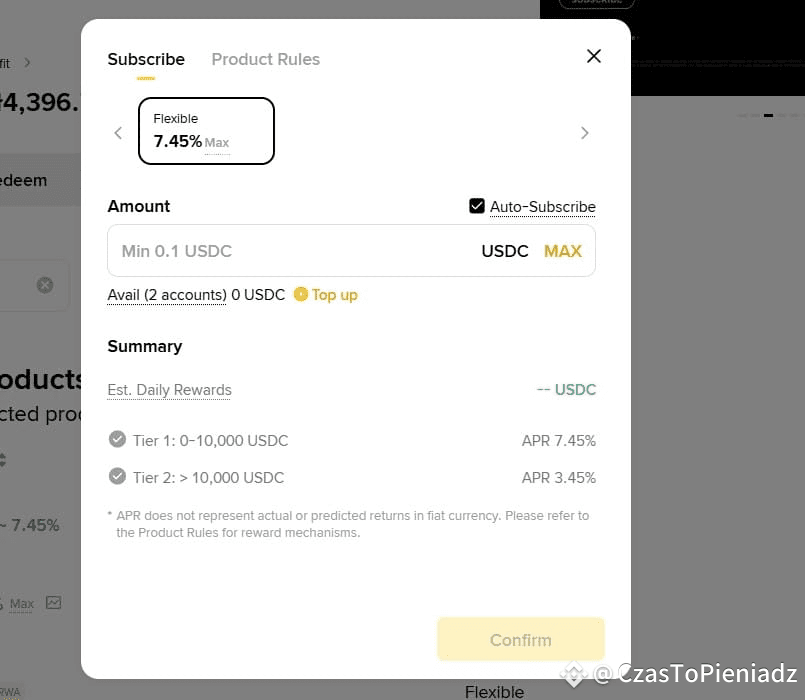 You can also check the Auto-Subscribe option, which will automatically transfer daily interest from a given cryptocurrency to a specific product in the earn tab.