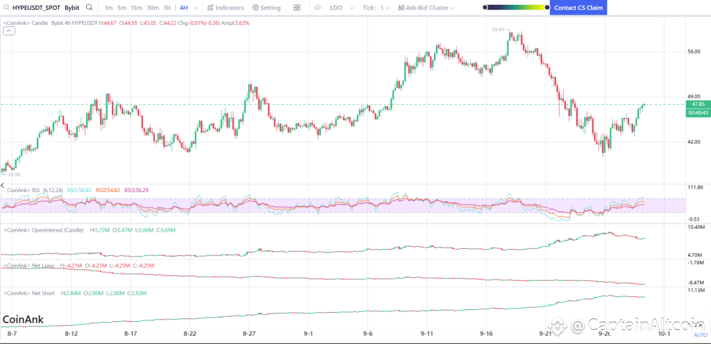 The 4-hour HYPE chart highlights a sharp comeback after a deep pullback earlier in September. After topping out near $59.45, HYPE price slid steadily and bottomed just below $42 at the end of the month.