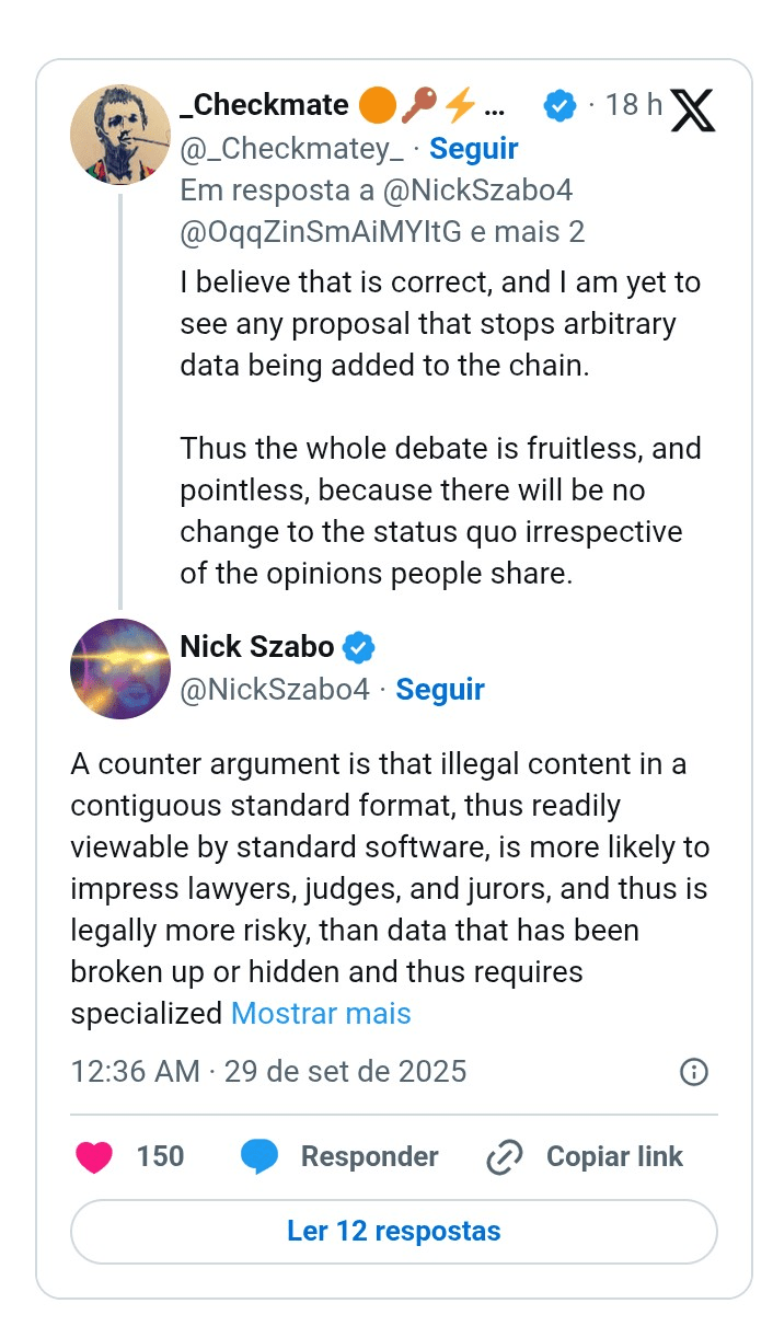 In his statements, he warned of risks that, in his view, are being neglected. One of the central points was the expansion of the use of OP_RETURN, which would allow recording much larger volumes of data directly on the blockchain. Szabo highlighted that the measure could bring not only technical complications but also legal implications.