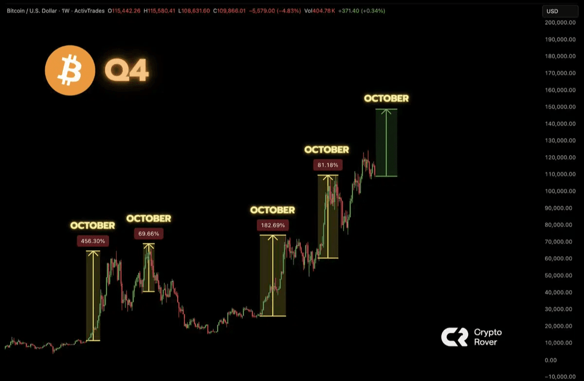 Look at this, my people: Bitcoin has just made a move that has us all raising our eyebrows. After flirting with $110,000 at the beginning of the week, it suddenly recovered and surpassed $112,000. This surge is what has us hyped to the max because historically, the fourth quarter (Q4) is the time when Bitcoin puts on its superhero cape. It's when we've seen brutal gains, like that +456% in 2021 or the +182% in 2023! If that streak repeats, hold on tight. 🤑
