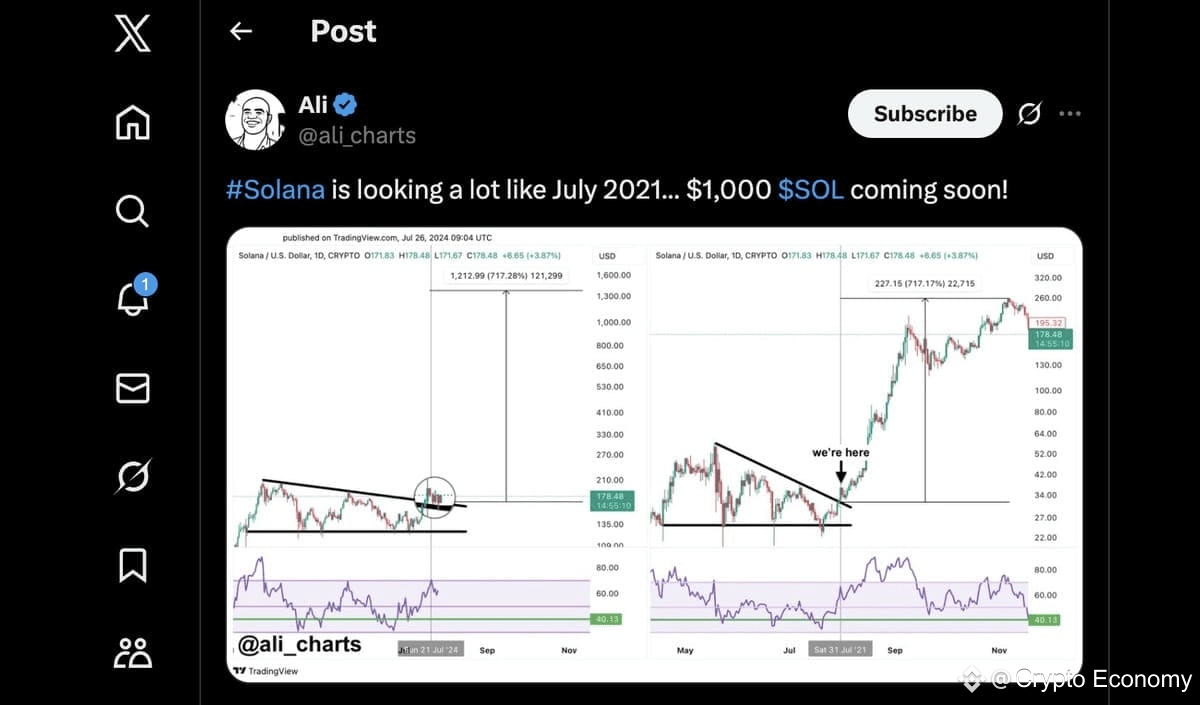 Today, the setup feels familiar. SOL is trading near $214, up over 30% from just a month ago. Some, like Ali Martinez, forecast that Solana could repeat the same pattern, potentially targeting $1,432. He points to similarities between current price action and the 2021 rally.