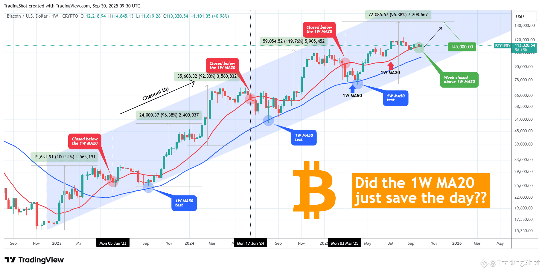 Last week was again a successful 1W candle close above the 1W MA50, third time in a month (since August 25) to do so. Technically that solidifies it as a Support and as long as it holds, Bitcoin has more probabilities to repeat at least a +96.38% rally ('weakest' rally it had on this Bull Cycle) and test $145000.