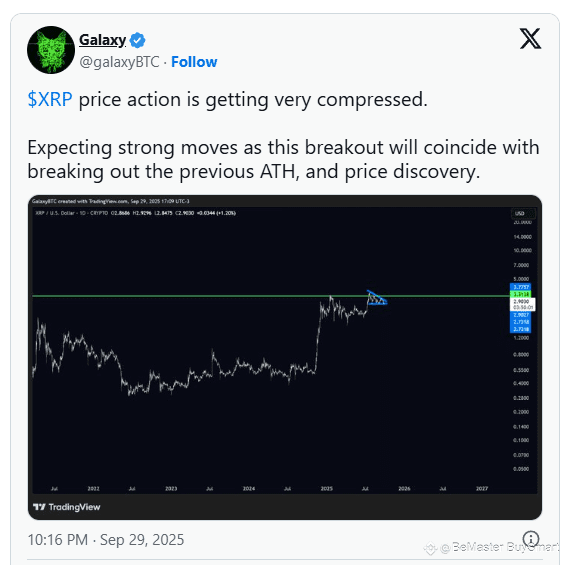 In a recent post on X, Galaxy highlighted that XRP’s chart is showing signs of extreme compression. According to the analyst, this tightening price action is happening just beneath the all-time high region, making the setup even more significant.