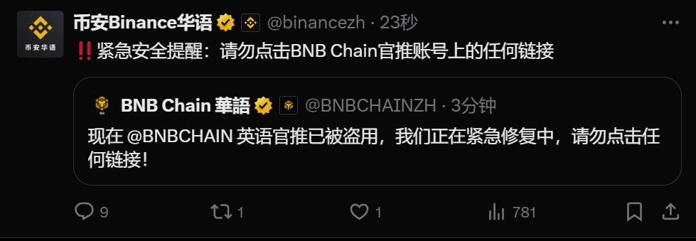 Deep Tide TechFlow news, on October 1st, the BNB Chain Chinese account stated that the @BNBCHAIN English official Twitter has been compromised and is currently under emergency repair, please do not click any links.