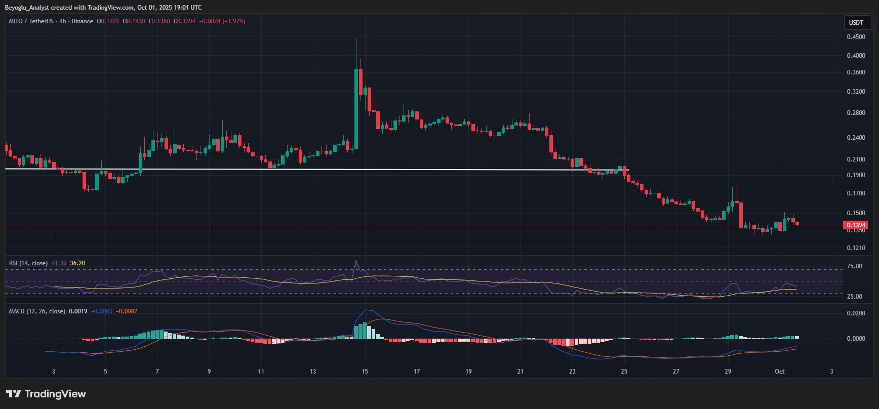 Analyst Muhammad Nabeel hit us with a cold shower with a chart that doesn't lie: while everyone is rising, Mito sees no light at the end of the tunnel. The token is trading at just $0.13 and, despite the general rally that started on Monday, Mito continues to plummet. This is not just a simple downturn; it is a warning sign that we cannot ignore. 🚨