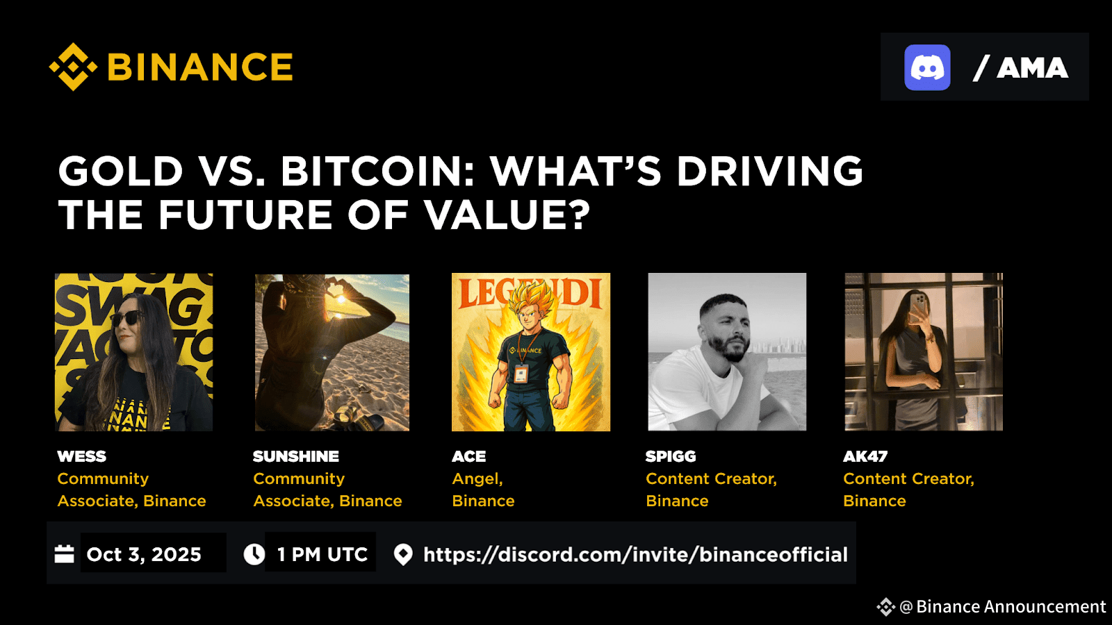 Join us on Binance Discord for an exclusive AMA on “Gold vs. Bitcoin: What’s driving the future of value?”. With our Community Associates, Angels, and Content Creators, we’ll dive into Gold and Bitcoin’s recent ATHs, their value over time, core value premises, and how blockchain could be a game-changer compared to gold reserves. Ask questions, gain insights, and win rewards!