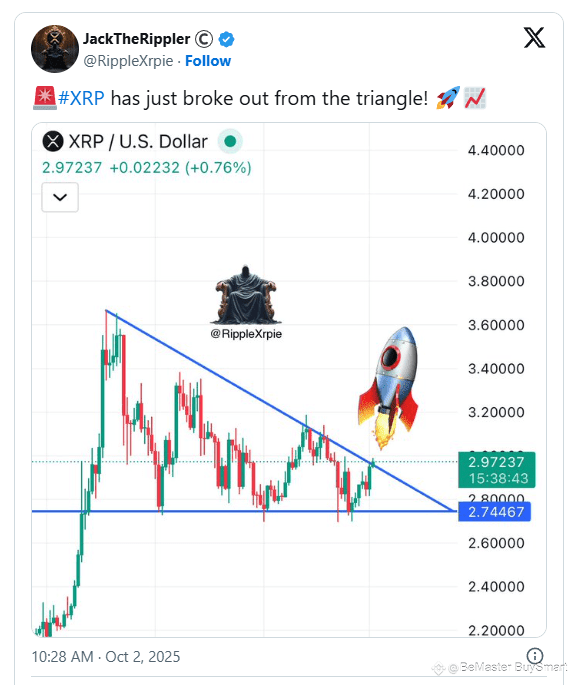 The breakout was highlighted by prominent analyst JackTheRippler on X, who shared a chart showing XRP breaching the upper boundary of a descending triangle. For weeks, XRP had been consolidating between a horizontal support zone in the mid-$2.70s and a descending trendline acting as overhead resistance.