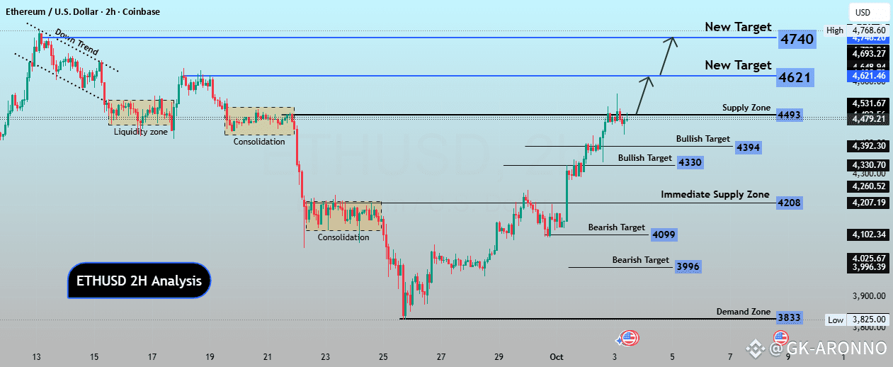 ETH is now entering an extension phase beyond the previous supply zone. The market structure remains bullish, with higher lows and strong momentum supporting further upside. Holding above $4,493 (now a key support zone) is critical for validating these new targets.