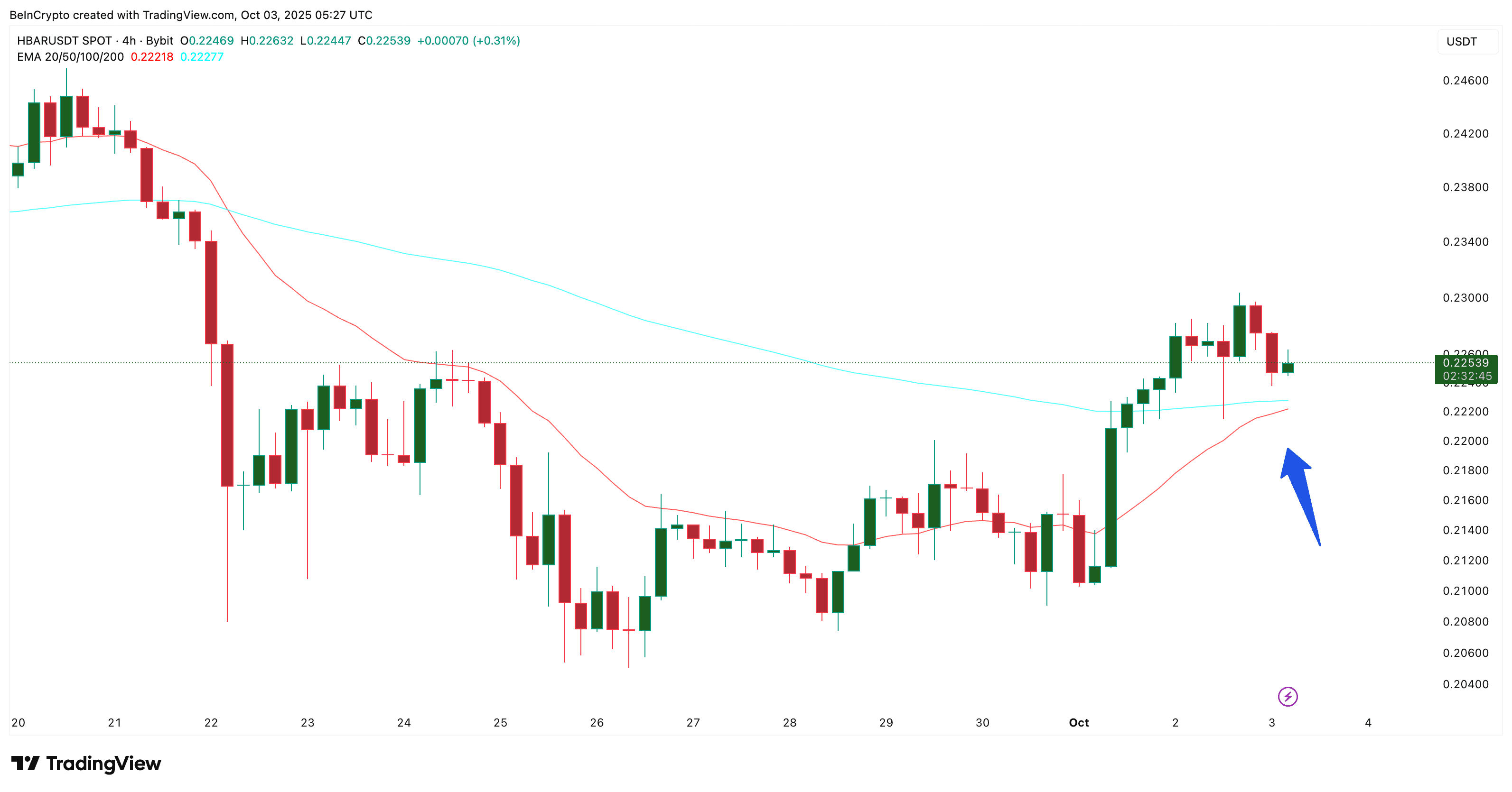 What we are seeing on the 4-hour chart of HBAR is that the Exponential Moving Average (EMA) of the short term (the 20-period one) is about to cross above the long-term EMA (the 100-period one). 📈