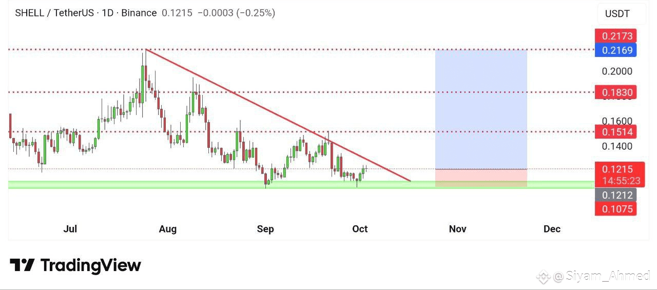 SHELL/USDT is forming a strong trend reversal pattern after weeks of consolidation near key support. The price is bouncing from the green demand zone and approaching a downtrend breakout level around $0.125. Once the descending trendline is broken, momentum could accelerate toward $0.15, $0.18, and potentially $0.21 targets. The structure shows clear accumulation with higher lows forming, indicating buyers are regaining control. Volume support and bullish sentiment suggest a strong rally is coming soon. Traders should keep an eye on breakout confirmation for potential long entries — this setup could deliver a major upside move in the coming days. 💥$SHELL