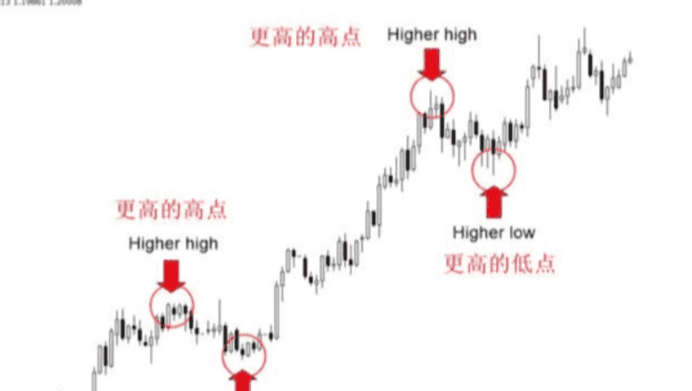 Higher highs and higher lows; the figure below is a typical upward trend: