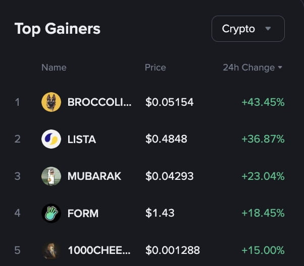 The top five tokens — BROCCOLI714, LISTA, MUBARAK, FORM, and 1000CHEEMS — are now leading Binance’s daily gainers list, collectively climbing more than 35% on average in the past 24 hours.