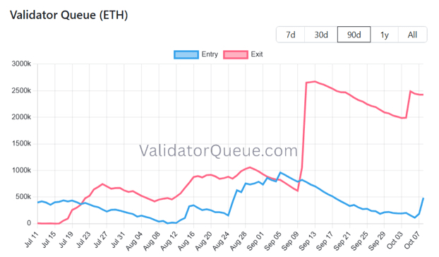 Data from ValidatorQueue shows that around 489,000 $ETH are waiting to be staked, most of which belong to Grayscale. In contrast, the amount of ETH waiting to be unstaked is much higher and has increased since early October, with over 2.4 million ETH queued for withdrawal.