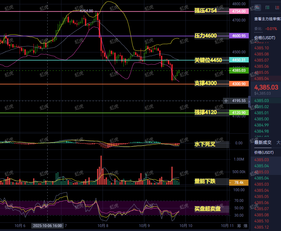From today's K-line chart, after failing to break the 4600 pressure level, the bullish momentum of ETH has significantly weakened. The current price is suppressed below the key level of 4450, and the 'Underwater Death Cross' indicator confirms a weak pattern, with volume continuously shrinking exposing weak buying pressure. More critically, if the 4300 support level is lost, the strong support at 4120 will face a bearish test, which means the decline could expand to 8%! However, if the price unexpectedly breaks through 4450, a short-term rebound towards the 4600 pressure zone is possible. Note that the data in the chart showing 'buying pressure oversold' indicates intense competition between bulls and bears. Rainbow Tiger's exclusive judgment: the main force is using sideways fluctuations to clean up retail investors' chips. If tonight it breaks below 4300 with volume, a crash may be imminent!