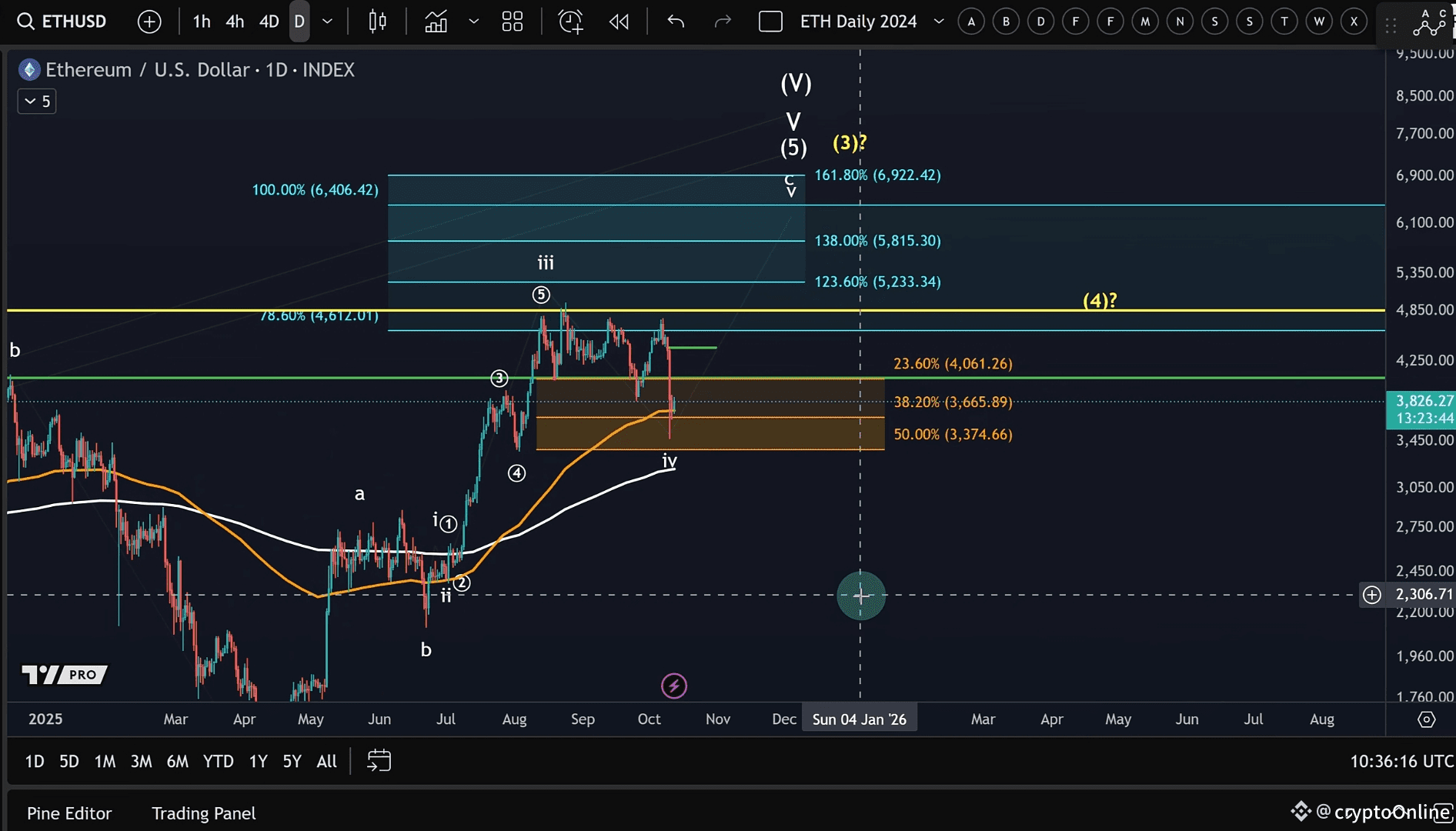 Ethereum’s current position aligns well with an Elliott Wave iv correction, which often finds support around the 38.2% Fibonacci retracement.