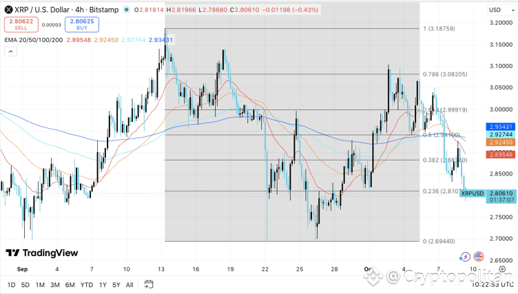 XRP is set to undergo a corrective phase as the price was unable to cross the resistance level around $3.08, settling momentarily around $2.80. The token is still declining below the significant EMAs around $2.89-$2.93, acting as an evidence of the absence of strong directional flow. Should XRP lose the support level around $2.80, experts have forecast the retest of the September low around $2.70 and fall under $1 by 2026.