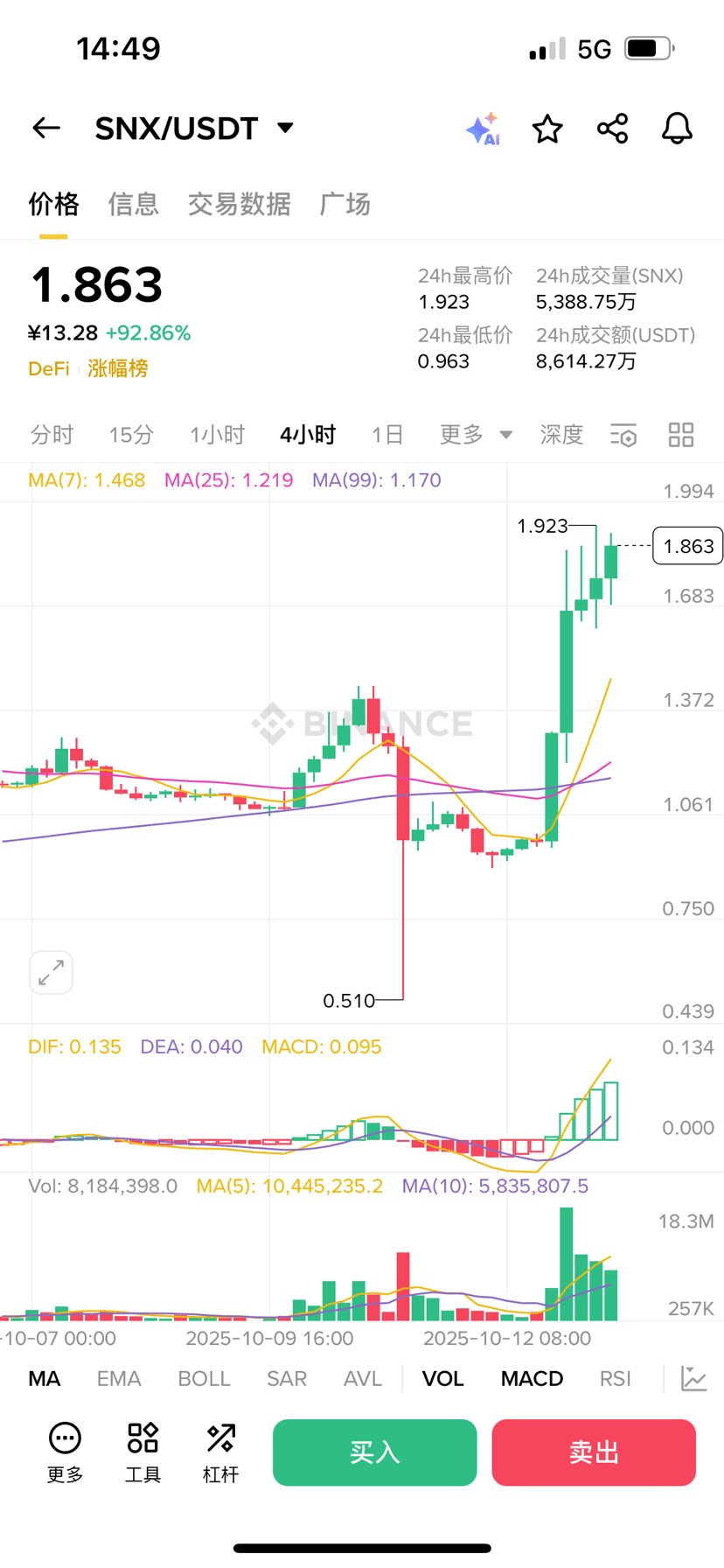 The performance of SNX has attracted a lot of attention. In just one day, the price surged over 80% from its low, reaching a maximum of 1.923 USDT, with trading volume also expanding to several million levels. Cryptocurrencies like this are often not simple—they have funds driving them, there are market makers willing to push the price, and market sentiment supports them.