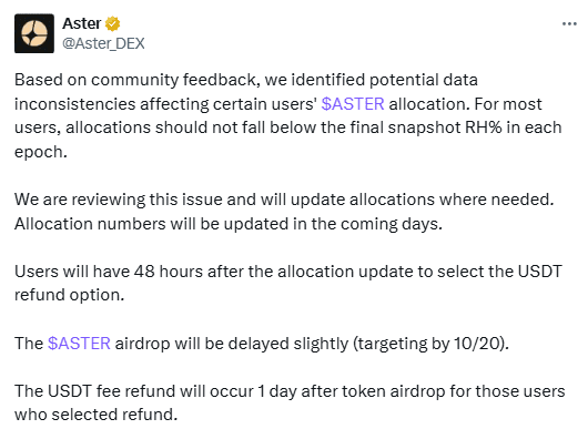 1️⃣ DeFiLlama delisting: Aster was removed from DeFiLlama, trading volume data has been suspended, raising market doubts about its liquidity and real trading volume. 2️⃣ Large token transfer: Over 6.1 million ASTER (about $12 million) was transferred to Binance, and the trades related to Galaxy Digital were interpreted by the market as a potential sell signal, exacerbating the selling pressure. 3️⃣ Airdrop delay: The second phase airdrop originally planned for October 14 has been postponed to October 20, causing market concerns due to uncertainty in distribution data.