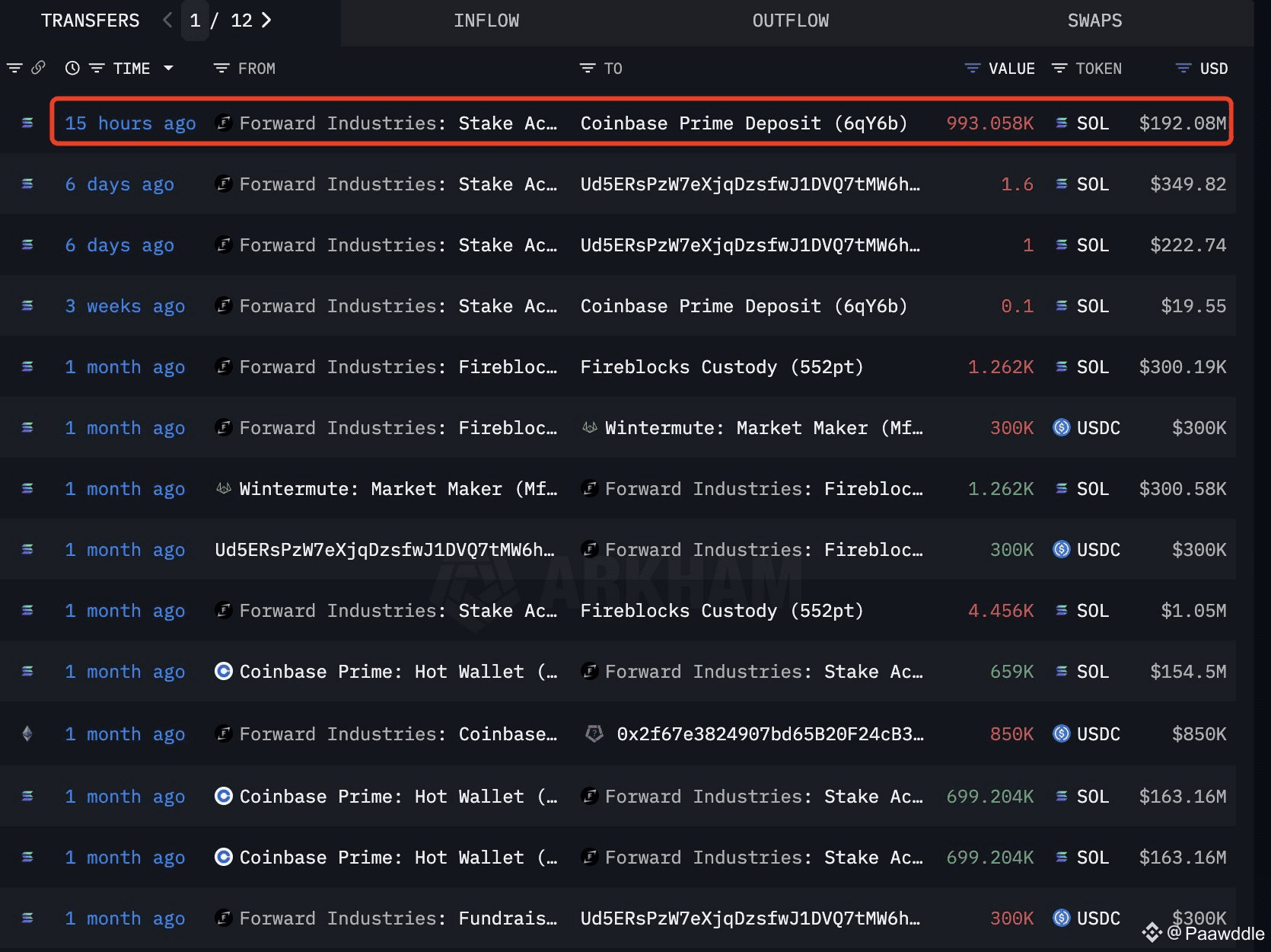 Following the deposit, SOL/USDT saw a surge in buy volume across Coinbase and Binance, pushing price from $ 198 to $ 204 within hours — indicating strong institutional absorption and short-term bullish momentum.”