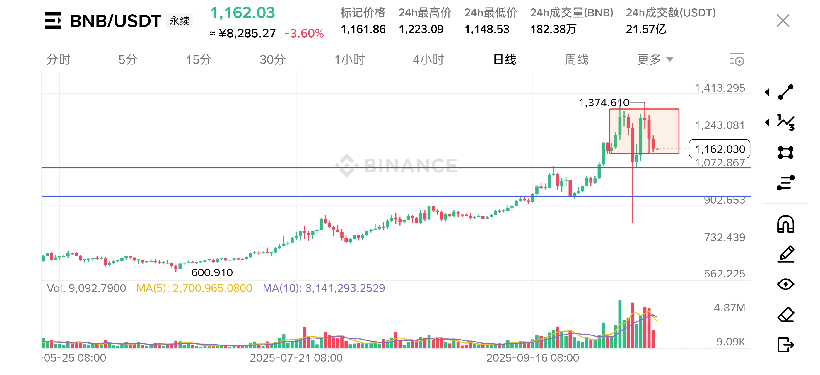 Scenario 1 (Rebound meets resistance and continues adjustment): If the price rebounds to around 1243.08 (previous support turns into resistance) under pressure, and the trading volume does not increase and break through simultaneously, it is highly likely to continue adjusting, even testing deeper support (such as 1072.87 or 902.65).