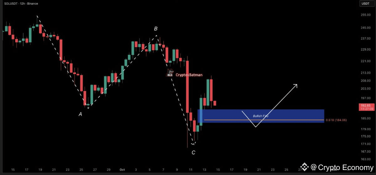 Besides, technical indicators also have a bullish bias. Recently, Solana has regained its Ichimoku Cloud zone and major moving averages on the 4-hour chart, which points to a structural recovery. An A–B–C corrective pattern is completed near $185, which indicates that there is a potential major bottom in place.