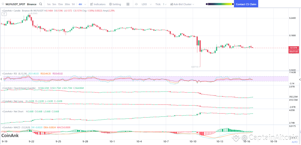 Looking at the 4-hour chart, WLFI price is still in a consolidation phase after some serious volatility. It dropped all the way to $0.0715 before bouncing back to the $0.13–$0.14 range, where it’s been moving sideways ever since.